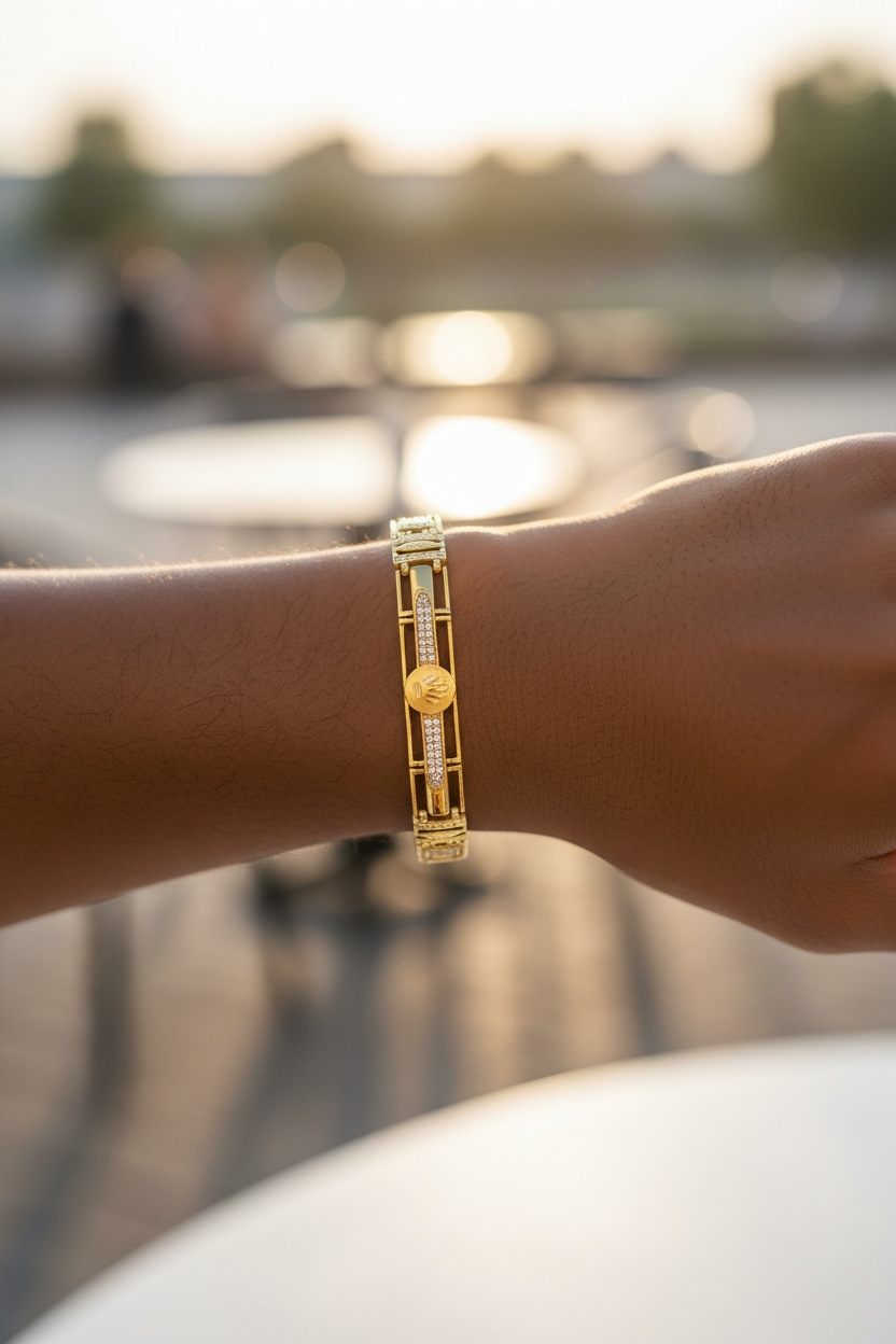 Finished in a rich gold tone with precision craftsmanship, the bracelet offers a premium look while remaining lightweight and comfortable. The secure watch-style locking mechanism adds both safety and a high-end feel, ensuring a snug fit and effortless wear.
