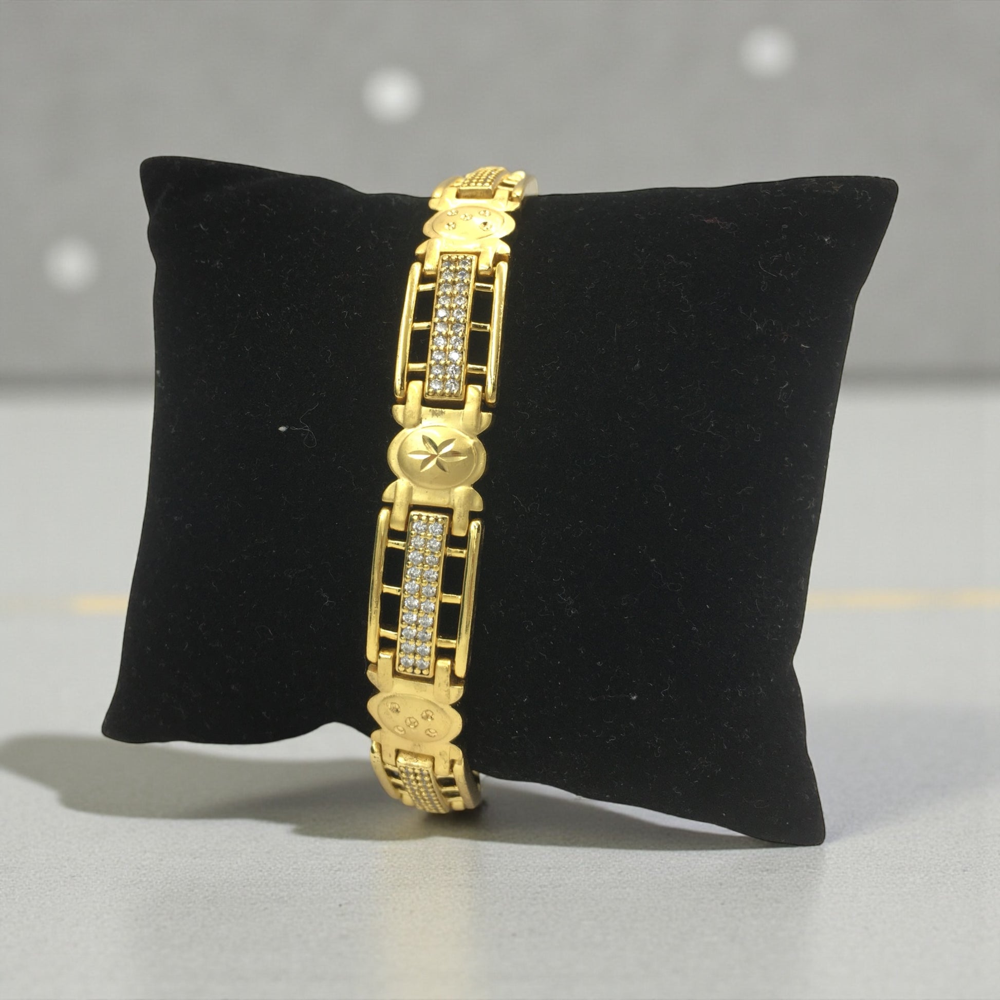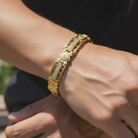 Finished in a rich gold tone with precision craftsmanship, the bracelet offers a premium look while remaining lightweight and comfortable. The secure watch-style locking mechanism adds both safety and a high-end feel, ensuring a snug fit and effortless wear.